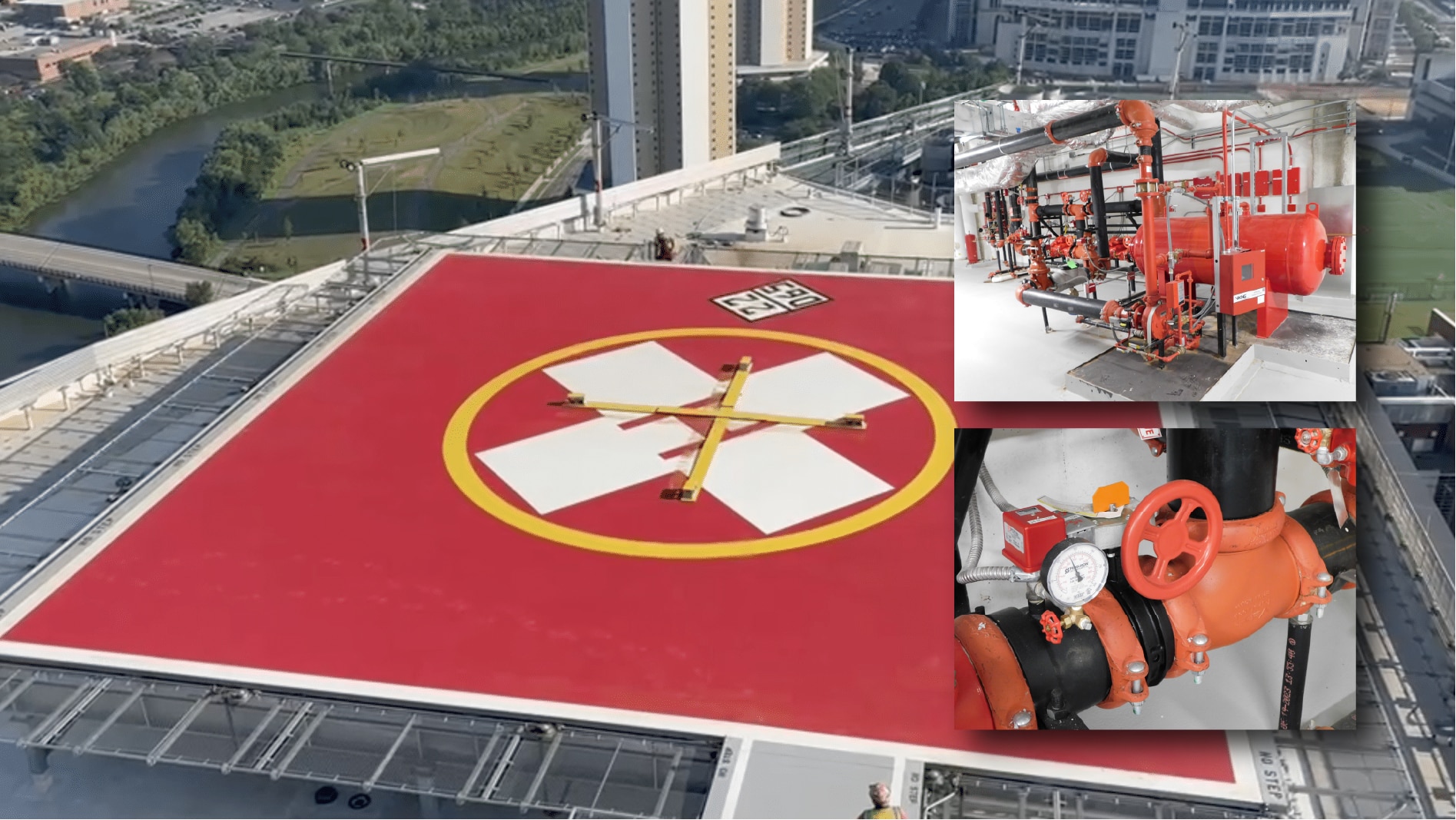 New to our team was the installation of fire protection for the hospital’s helipad. The helipad system, located on the 26th floor, required precise planning to ensure effective fire protection. The team addressed tight tolerances and structural constraints and coordinated with other rooftop systems to deliver a successful solution.